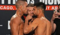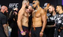 MIAMI, FLORIDA – APRIL 10: (L-R) Opponents Jiri Prochazka of the Czech Republic and Carlos Ulberg of New Zealand face off during the UFC 327 ceremonial weigh-in at Kaseya Center on April 10, 2026 in Miami, More...