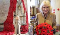 Queen Camilla cracks a joke as she views incredible knitted poppy display