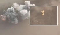 Moment Russian tank explodes over land mines sending burning soldier running for his life