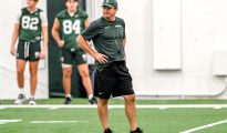 MSU football head coach Jonathan Smith plays tennis with Michigan State tennis star Ozan Baris