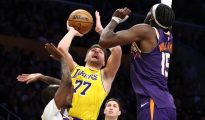 Lakers star Luka Doncic shoots over Suns center Mark Williams during the Lakers' 125-108 loss at Crypto.com Arena on Monday night. (Robert Gauthier / Los Angeles Times) Luka Doncic sat at the table for More...